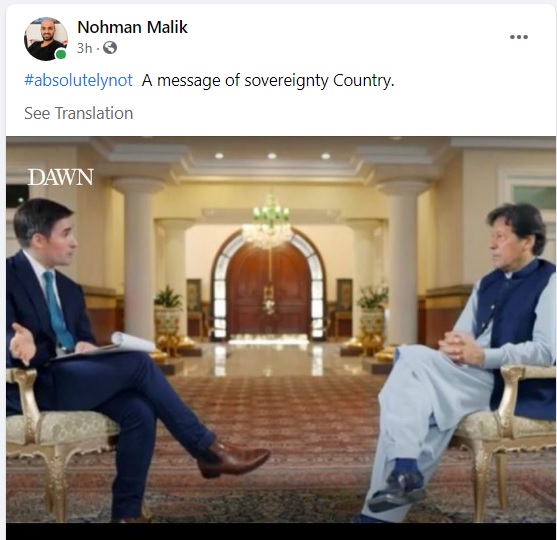 ڈاکٹر نعمان ملک نے عمران خان کے انٹرویو کی تصویر کو شیئر کرتے ہوئے لکھا ایک خودمختار ملک کا واضح پیغام #AbsolutelyNot