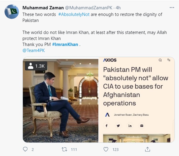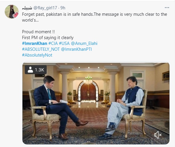 پاکستان میں اس وقت وزیر اعظم عمران خان کے انٹرویو کے دوران کہے الفاظ سوشل میڈیا پلیٹ فارمز ٹوئٹر اور فیس بک پر #AbsolutelyNot ٹاپ ٹرینڈ ہیں ،جہاں ہزاروں صارفین اس بارے میں اپنی رائے کا اظہار کر رہے ہیں